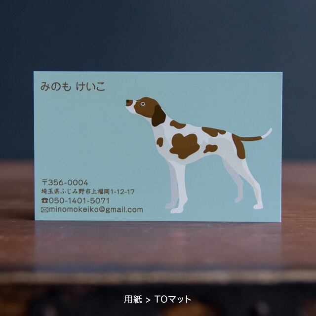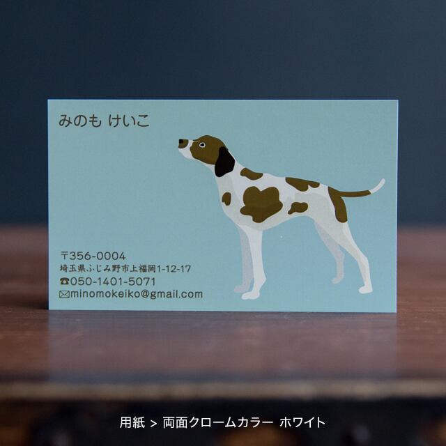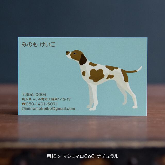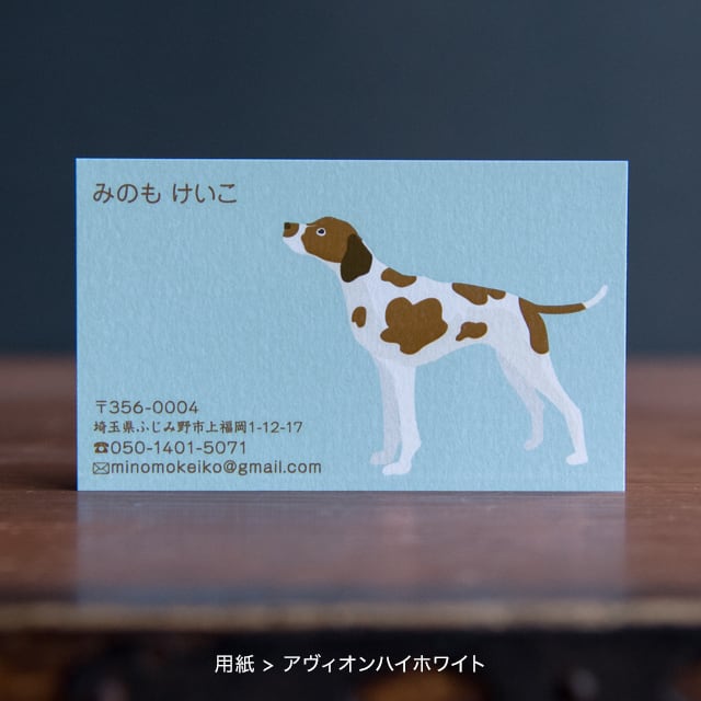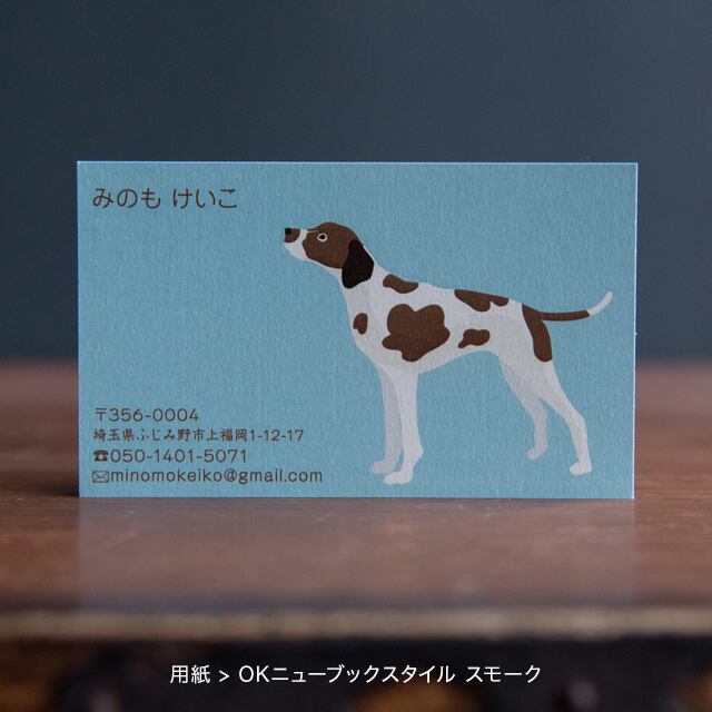 名刺 テンプレート 印刷|MTG-015 犬と空色|用紙は表の薄いグレー(裏面は白)と紙の風合いが優しげなOKニューブックスタイル スモークが特におすすめ