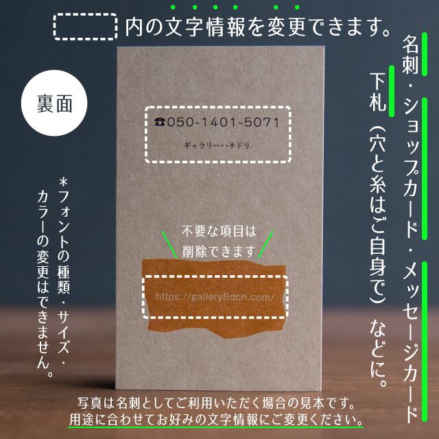 ご購入の際「購入者情報の入力」ページにある備考欄に名刺に印刷する文字情報(下のA~H)を必ず明記してください。文字のサイズ・色・位置は変更できませんが、不要な項目は削除することができます。不要な項目がある場合は(例)メールアドレスが不要な場合「メールアドレス:不要」とご入力ください。